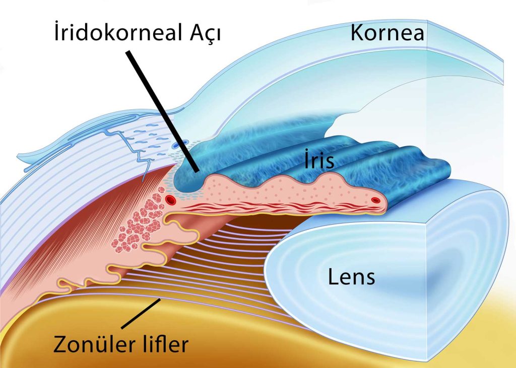 Kapalı açılı göz tansiyonunda kornea ile iris arasındaki açı çok dardır. Bu açıya iridokorneal açı adı verilmektedir. İridokorneal açı genellikle 35-40 derece arasındadır. Bu açıdan gözümüzün içindeki sıvı emilerek gözü terk etmektedir. Ancak iridokorneal açı dar olduğunda-ki bazı kişilerde tamamen bile kapalı olabilir-göz içi sıvısının gözü terk etmesi sorunlu hale gelir. Bu da göz içi basıncının artmasına neden olur. Bazı kişilerde iridokorneal açı doğuştan dardır. Özellikle göz derecesi hipermetrop olan kişilerde iridokorneal açı dardır. Bu kişilerde akut açı kapanması glokomu ya da kronik açı kapanması glokomu adı verilen klinik durumlar ortaya çıkabilmektedir.